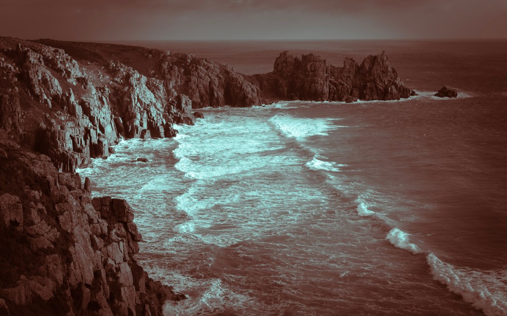 This pondering has culminated in a pleasing first set of image contributions for a Cornish contingent of the ‘Incidental Landscapes’ collection. I have yet to fully realise the colour balance that will assume the title of the chosen county colours; For me, blue and yellow reflected the cold and bleak yet often illuminative qualities of Scotland in early spring; Green and orange hints at the genuine coverall greenness of Ireland coupled with the rich and sometimes muggy warmth of our early summer visit there. The green and orange is also a gently playful nod to the national colours of Southern Ireland, as is the blue to the Scottish flag. The standout colours for me, here in my home county are gorse flower yellow, ocean turquoise, rain sky grey and autumn bracken burnt orange. The shades of turquoise in particular never fail to astound me when they reveal over in the ocean’s waters here in certain conditions. In summer most places are varying shades of green, much like Ireland, but in the shouldering seasons there is the trademark orange of the spent Bracken blanketing the valleys and cliff tops overlooking the ocean; and so I feel that this rich orange base colour for the shadows and darker tones, paired with a complimentary and uplifting turquoise for the highlights and lighter tones might be a uniquely identifiable and contrasting combination to harmonise with the Scottish and Irish split tone contingent. The rustic orange hinting at the iron, tin and copper in the ground and the turquoise of the sea and the sky and the sand combined.